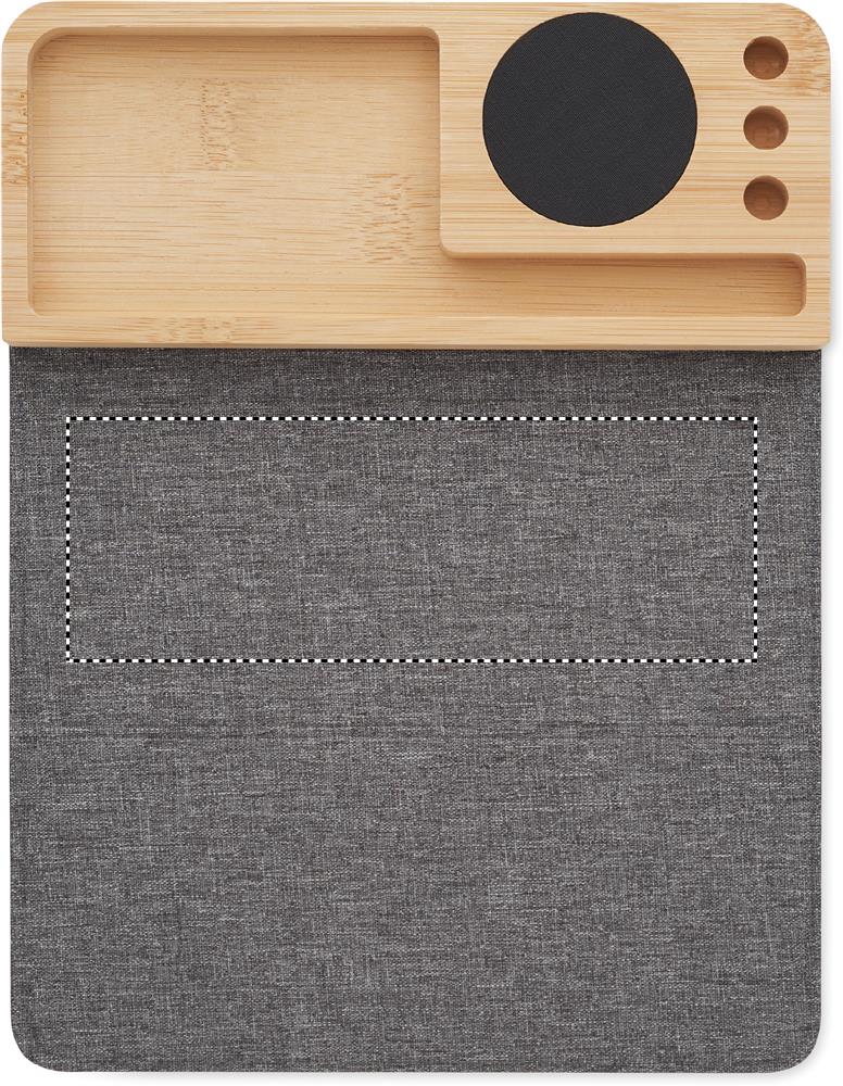Беспроводное зарядное устройство и настольный органайзер из бамбука с подставкой для телефона, 3 держателями для ручек и складным ковриком для мыши из RPET. Выход: DC 9V/1.67A (15W). Совместимо со всеми устройствами с поддержкой QI, такими как последние модели Androids, iPhone® 8, X и более новые.