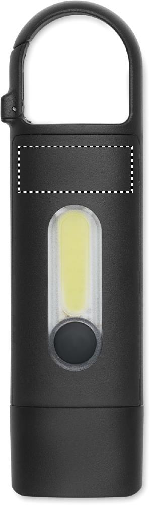 Uppladdningsbar COB-ficklampa i fickformat i ABS med karbinhake. Nödljus och 3 ljuslägen. 1 x 3,7 V, 200 mAh uppladdningsbart litiumbatteri (medföljer, kan inte bytas ut).