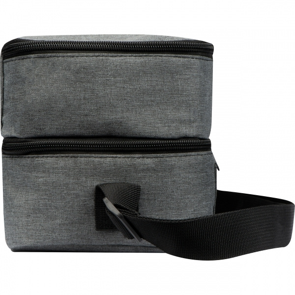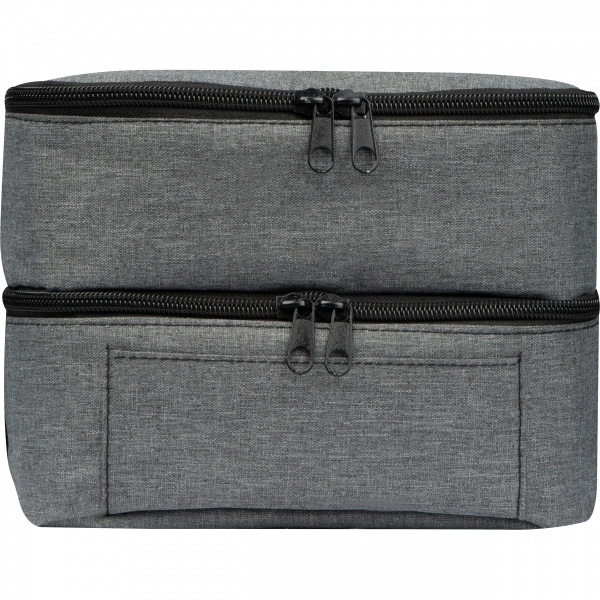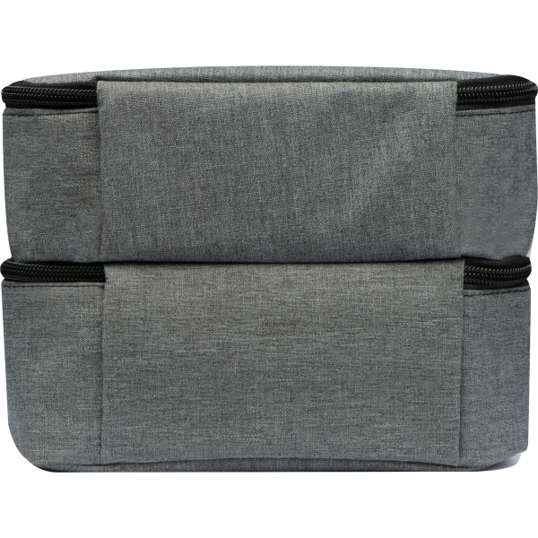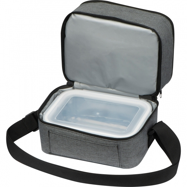 Den idealiska följeslagaren inte bara för lunchrasten. Denna tvådelade kylväska i polyester har en exakt passande lunchlåda i glas (1 000 ml) i det nedre facket. Tack vare väskans isolering kan maten hållas varm längre och inte bara kylas. Vi trycker din logotyp på toppen.