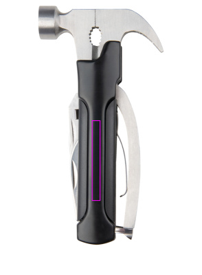 Multifunktionsverktyg (rostfritt stål) bestående av en hammare, en fil, två blad, en såg, en spårskruvmejsel och en flasköppnare. Medföljer ett matchande fodral där vi trycker din logotyp i mitten.