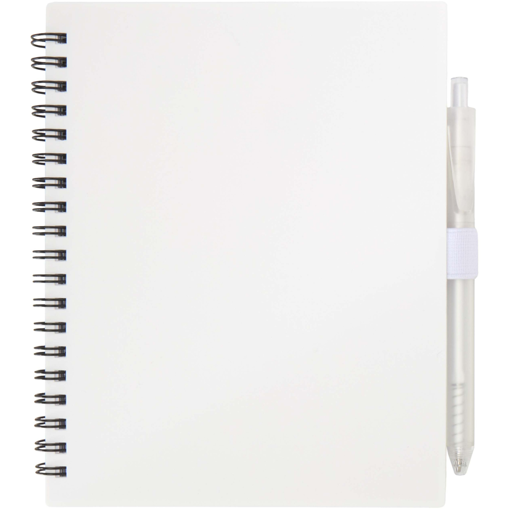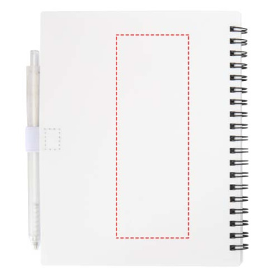 Anteckningsboken Niove med mjukt omslag är tillverkad av återvunnen plast och innehåller 70 prickade blad på 70 g/m² papper. Anteckningsboken har fyrkantiga hörn och en ögla för penna. Storlek på anteckningsbok: 140 x 178 mm. Kulspetspennan är också tillverkad av återvunnen plast. Bläckfärg: Blå. Skrivlängd: 1000 meter. NIB-storlek: 1,0 mm.