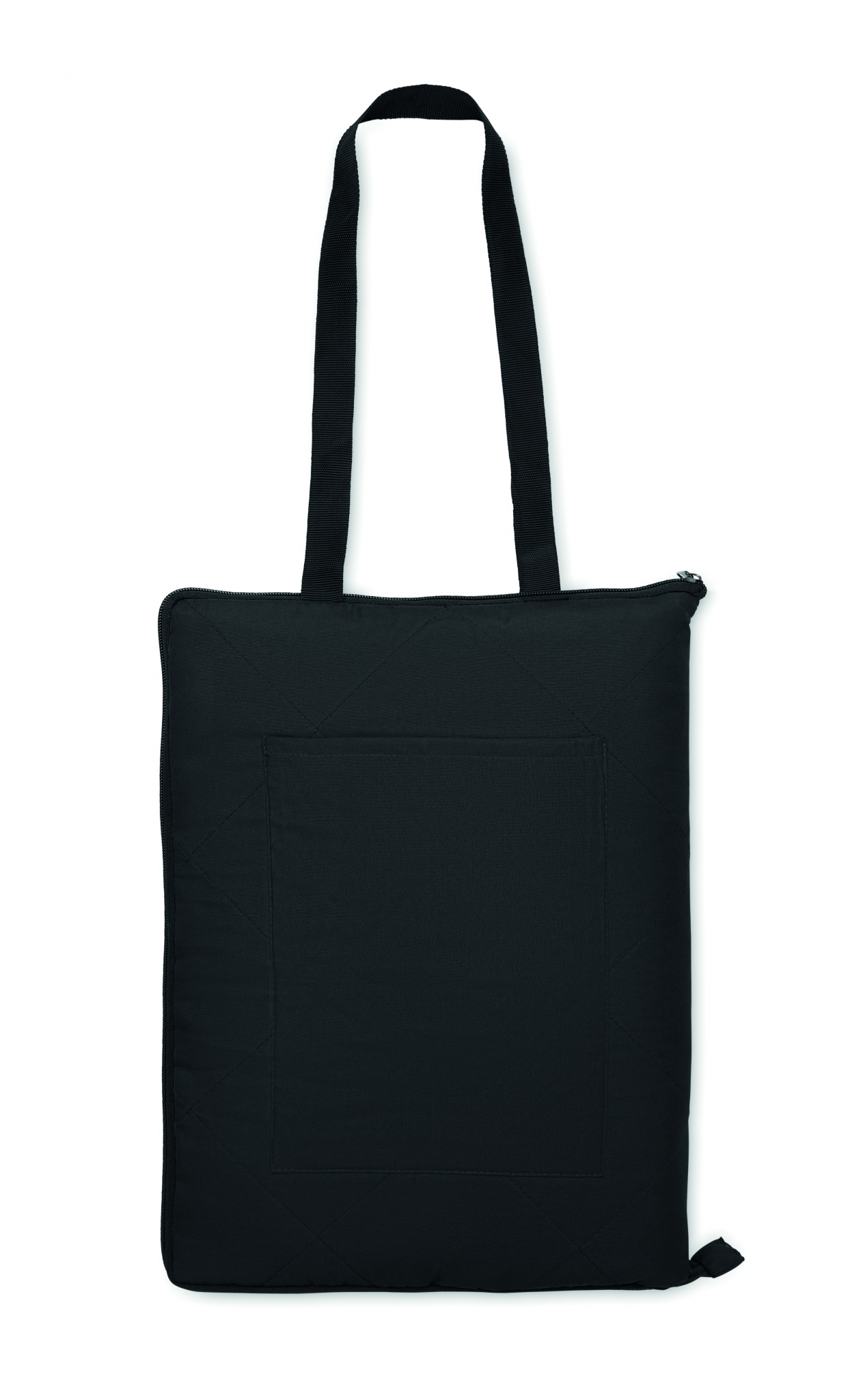 Vikbar quiltad picknickfilt med plastbelagd PEVA på baksidan. Fälls ihop till en praktisk bärväska och har en justerbar axelrem. Väskan har en stor sidoficka på framsidan.