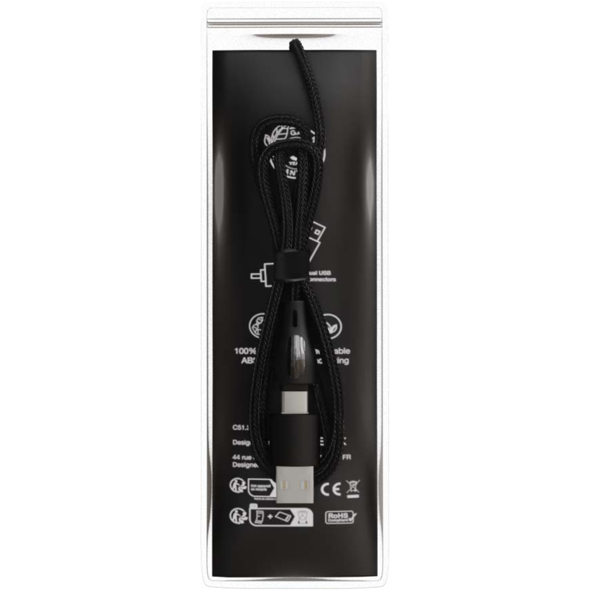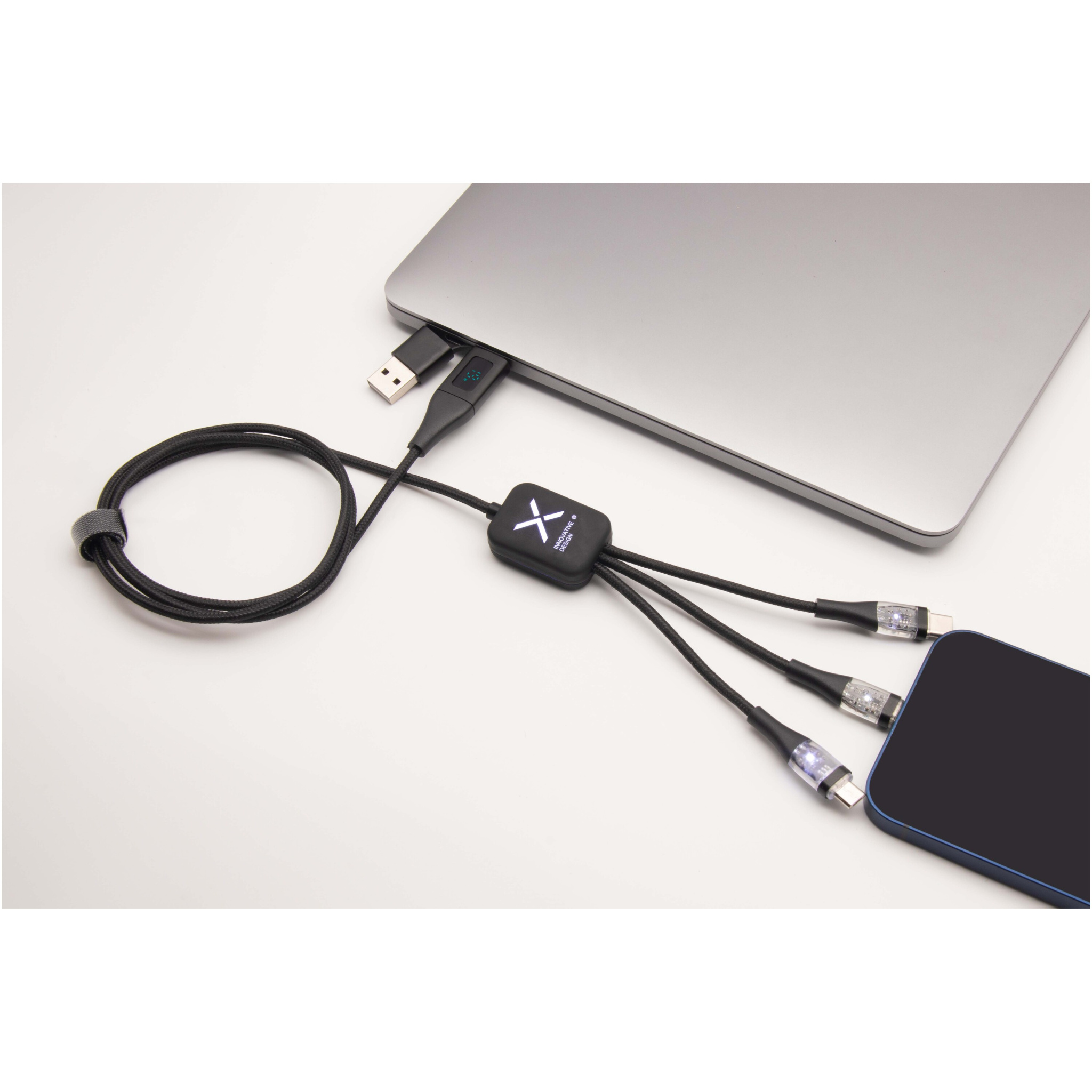 5-i-1 60 W snabbladdningskabel av återvunnen PET med upplyst dubbelsidig logotyp med 3 kontakter (Type-C, iPhone och Android). Den dubbla USB-A + USB-C-ingången gör kabeln 100 % kompatibel med de senaste datormodellerna. Kabeln kan ladda flera enheter samtidigt. Levereras med en återvinningsbar TPU-påse och en inlaga av återvunnet papper. Kabellängd: 1 meter.