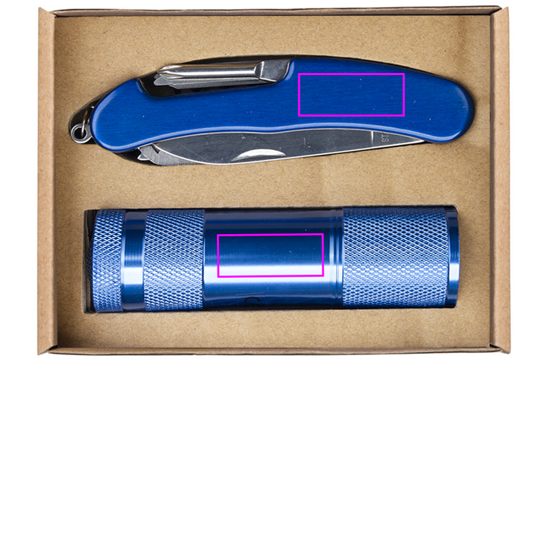 Set bestående av en ficklampa i aluminium med nio lysdioder och en fickkniv. Vi laserar din logotyp på ficklampan och fickkniven i samma storlek. Tre AAA-batterier ingår.