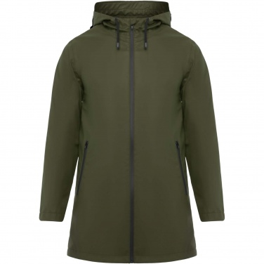 Vattentät regnjacka. Huva med topp. Värmeförseglade dragkedjor och sömmar. Kontrasterande detaljer i svart. Två sidfickor med dragkedja. Slits i bakre fållen. Borttagbar etikett. Vattentät. Modellen är 185 cm och bär storlek M.