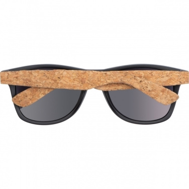 Svarta, klassiska solglasögon med UV 400-skydd, filterkategori 3, högkvalitativ plastbåge och skalmar i korklook. Din logotyp kommer att tryckas på en hängare.