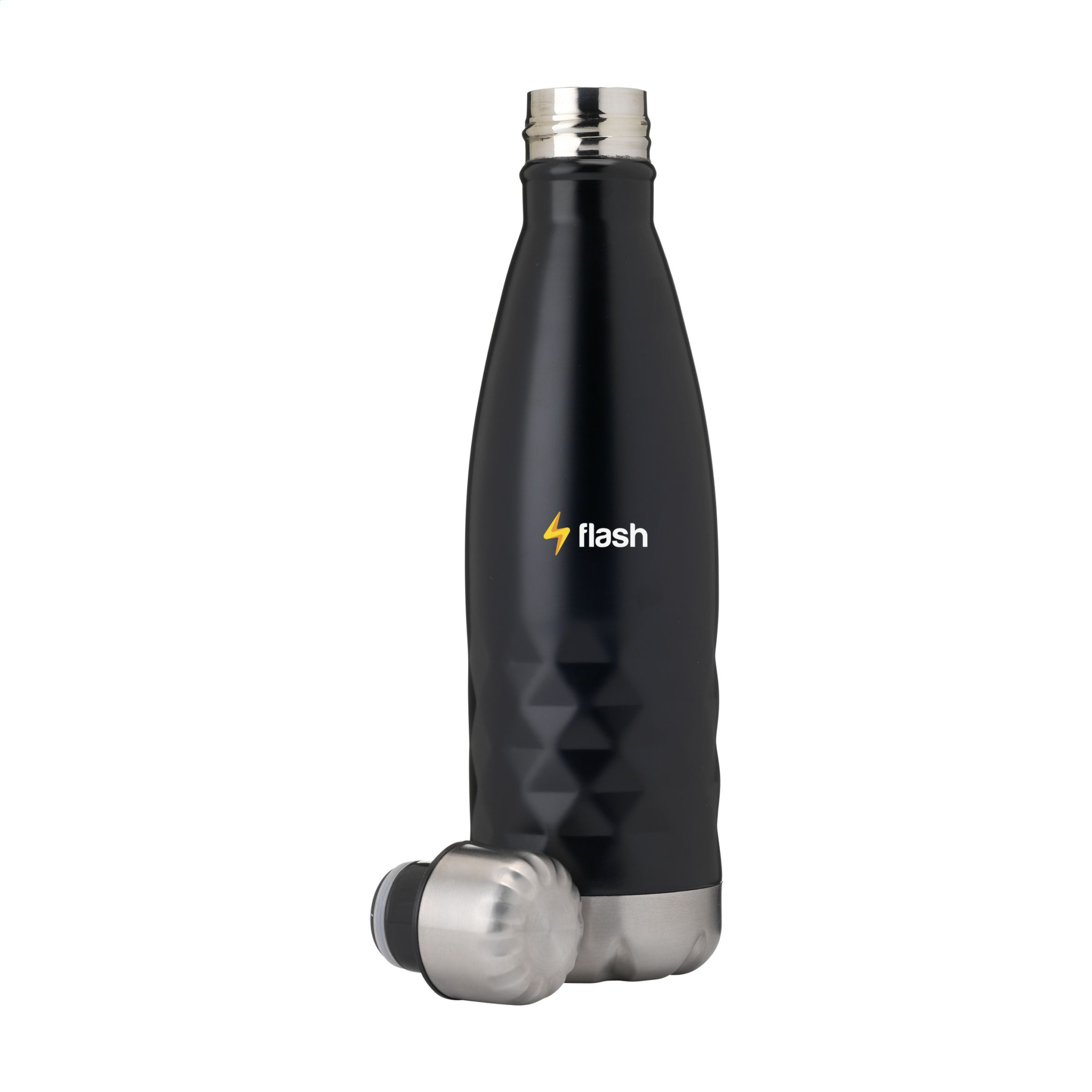 Dubbelväggig, läcksäker vattenflaska/termoflaska i rostfritt stål med distinkt 3D geometriskt diamantmönster. Lämplig för att hålla temperaturen på kallt eller varmt vatten. Kapacitet 500 ml. Varje artikel är individuellt förpackad.
