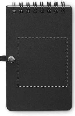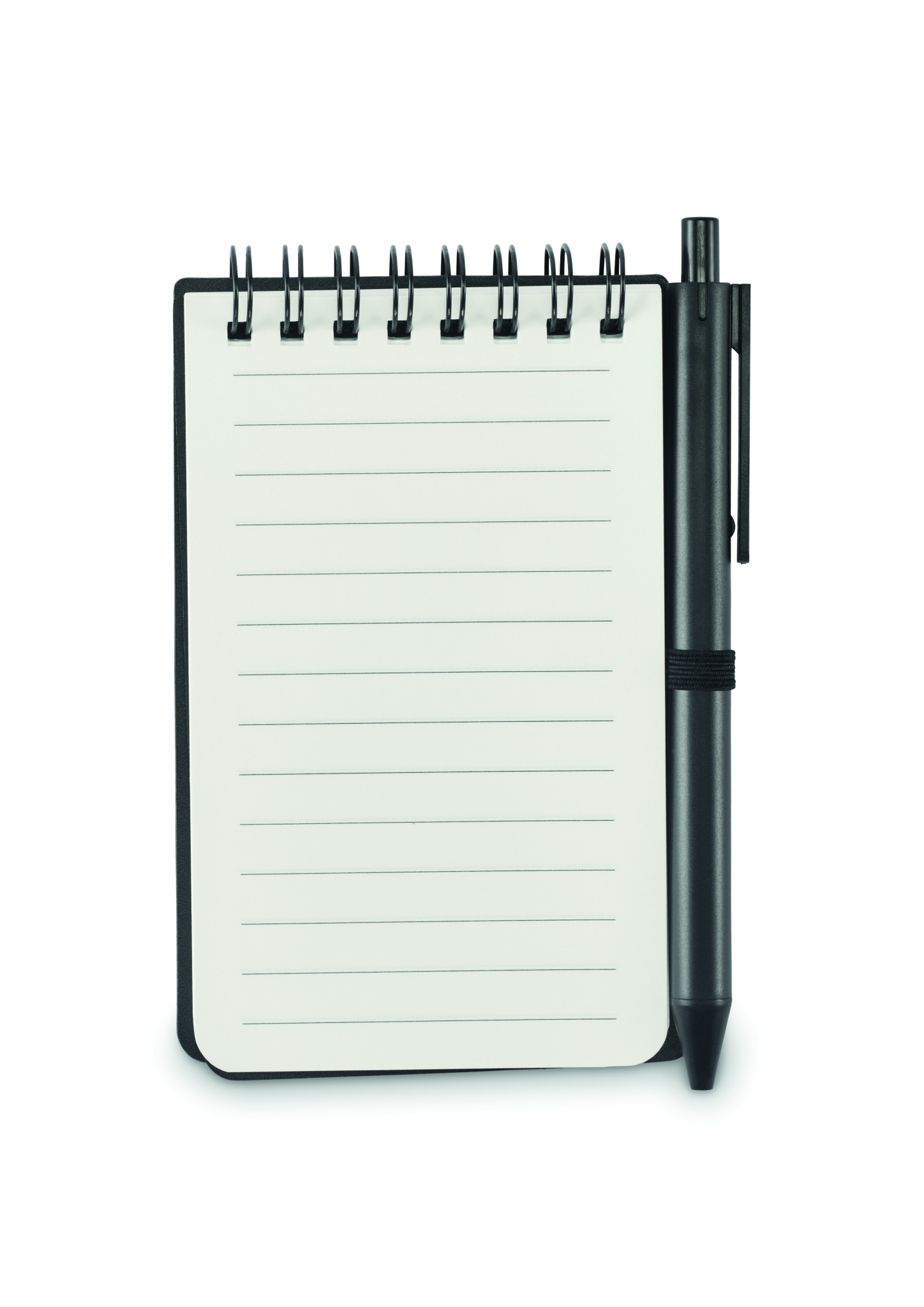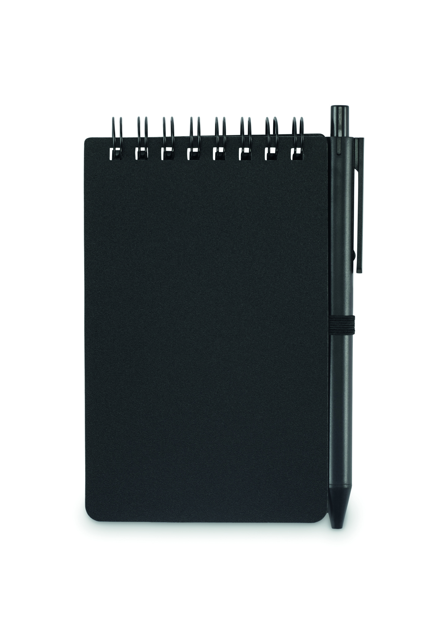 Anteckningsblock i fickformat i PP-omslag med vattenavsidande sidor och penna. Dubbeltrådig. Mineralpapper 120 gr/m², 50 ark linjerade. Blått bläck. Elastisk förslutningsrem och pennhållare.