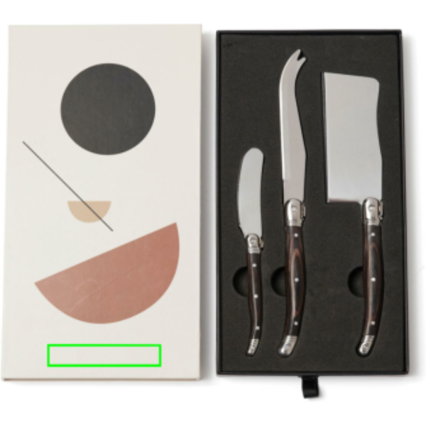 Ett exklusivt ostset som består av två stycken ostknivar och en smörkniv med svart handtag av pakkaträ och rostfritt stål. Förpackas i en exklusiv presentkartong.
